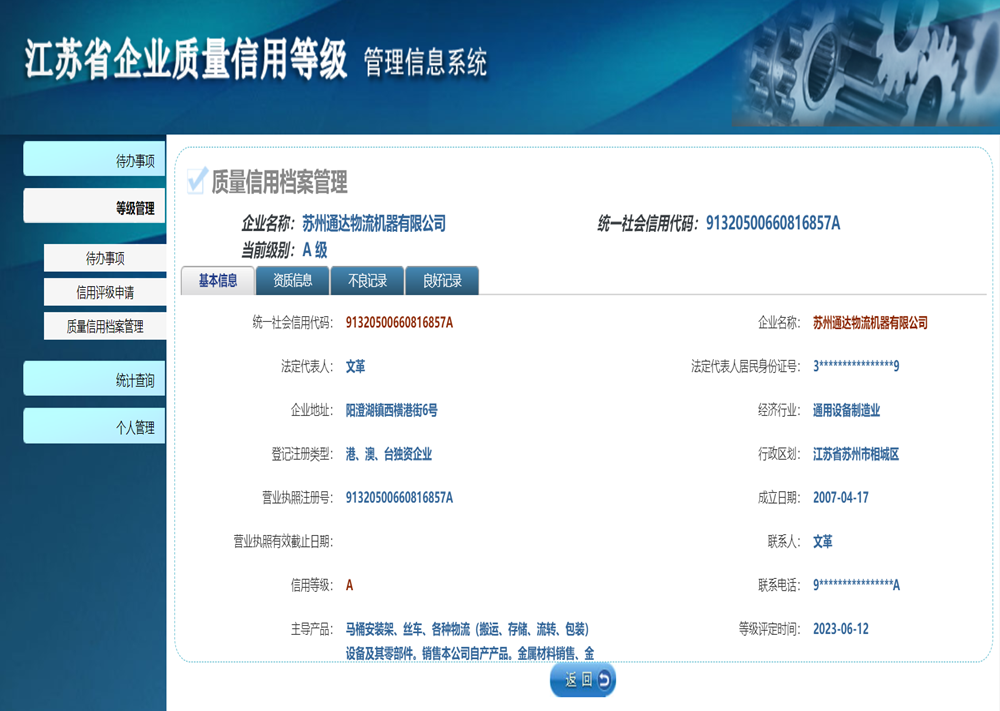 江蘇省企業(yè)質(zhì)量信用等級(jí)A級(jí)